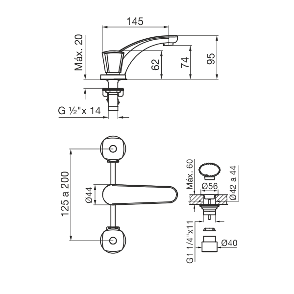 | Caudal | Caudal mínimo de salida a presión estática 0,4 BAR y caudal mínimo de alimentación de 20 lts por minuto (en conexiones fría y caliente): 12 lts por minuto. |